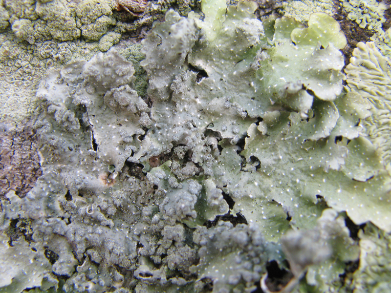 ウメノキゴケ科。葉状部の表面に白色の斑点が散在している。粉芽塊がみられる。