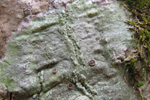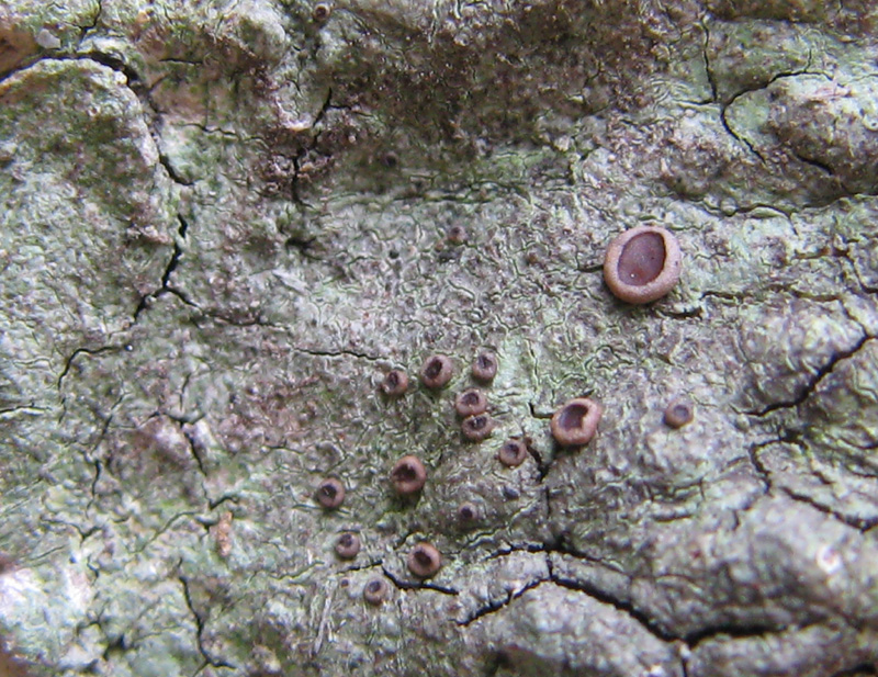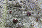 カエデの樹皮に生えていた。地衣体は灰緑色。子器は3mmぐらいになる。