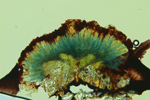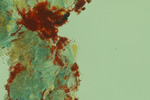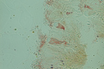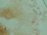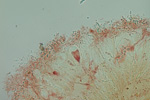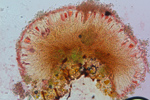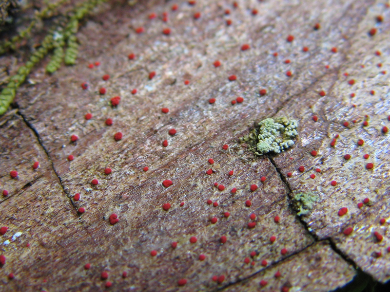 スギの樹皮に生えていた地衣類。子器は赤い。