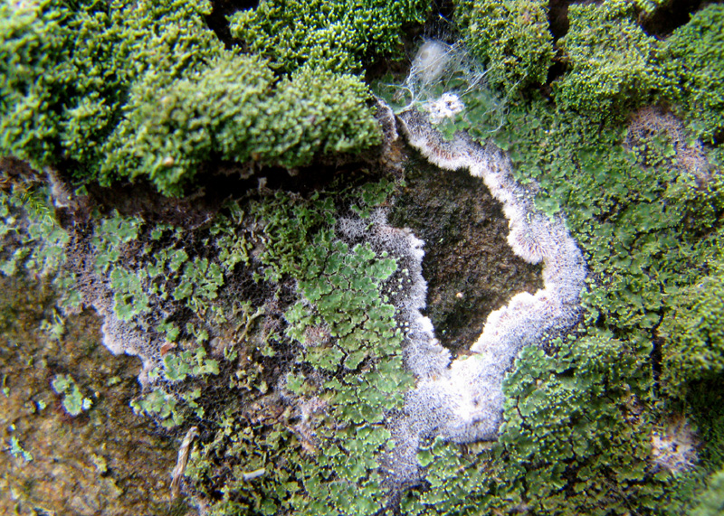 地衣体は北向きの石垣に生育していて、夏季は午前中の早い時期に、