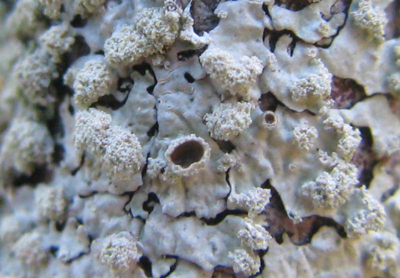 ウメノキゴケ科。中央部に裂芽ができています。