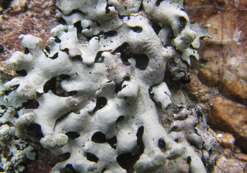 地衣体は葉状で分岐し、先端部に丸い粉芽塊をつける。