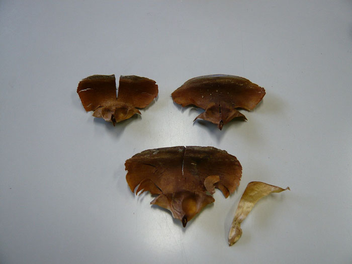 これが花のようなものの正体です。画像は落ちていた果鱗と種です。種についている羽が
