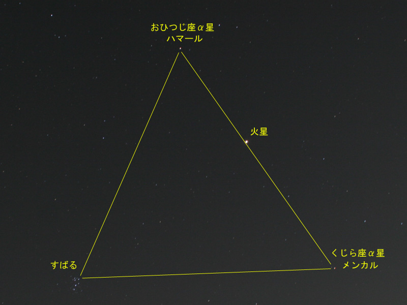 おひつじ座のハマール、くじら座のメンカル、すばるで三角形をつくり目印にしました.