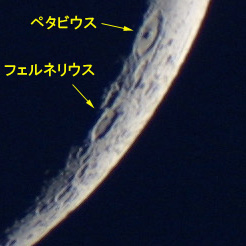 写真の上部にくっきり見えるクレーターがペタビウス。