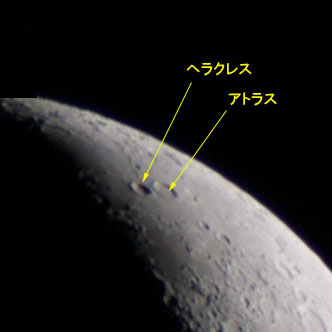 くっきり見えるクレーターは、ヘルクレス(左)とアトラス(右)です。