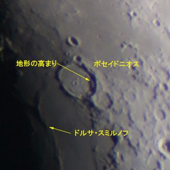 晴れの海の西縁に位置するポセイドニオス。かろうじて溶岩流に呑み込まれるのをまぬがれた。
