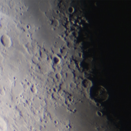明暗境界線上に輪郭のみえる大きなクレーターがポセイドニオス。
