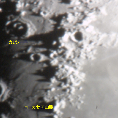 右上のクレーターに注目しよう。クレーターの縁にも朝日が当たって神秘的な姿が出現した。