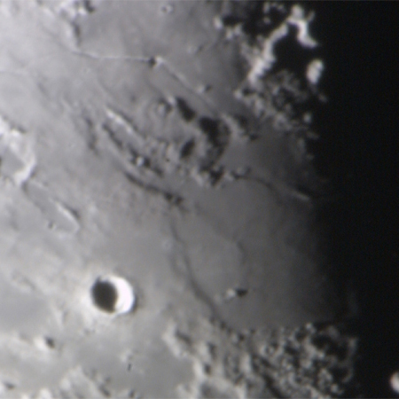 写真下の線状の地形がヒギヌスの谷。蒸気の海の中に形成されている。