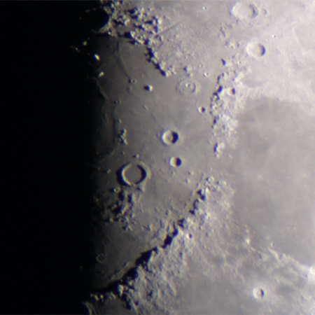 アペニン山脈の東斜面に日光が当たり、コノンと名づけられた小さいクレーターが白く光ってみえる。