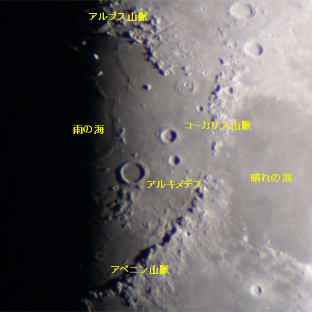 アペニン山脈の東斜面に日光が当たり、コノンと名づけられた小さいクレーターが白く光ってみえる。