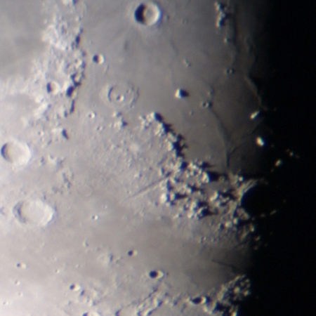 峨眉山の秋空に輝く半月。川面に浮かぶ月影が水とともに流れゆく-。 李白が志を抱き、故郷を後にする時に詠んだ七言絶句の冒頭。旧友に別れを告げら れなかった李白のそばに月がいた。唐の代表的な歌人は生涯、友人として月をこよな く愛した。 半月の見どころは、長さ180kmに達するアルプスの谷。雨の海をふちどる荒々し いアルプスの峰々を断ち切る。鋭くナイフを入れたようなこんな地形はほかにはない 。 地球で似たところを探すとすれば、大地が裂け、小さい海ができようとしているア フリカの大地溝帯。 かつてこの地でどんあ地殻変動があったのだろうか。
