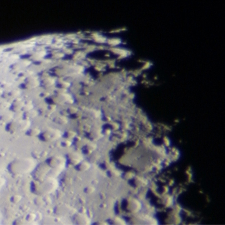 明暗境界線上に形のいいクレーターがみえる。中央丘があり明るく光って見える。