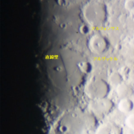 下弦の月ないし上弦の月を眺めると、雲の海あたりに明暗境界線が走っている。そ の東縁部に直線壁が現れる。上弦の月では直線壁の影が平原にくっきりと映しだされ 、東側が地塊が相対的に高いことが読みとれる。逆に下弦の月では直線壁の斜面に夕 日が当たり一際明るく輝いている。 直線壁の長さは110km。にも関わらず東側の岩盤と西側の岩盤の標高差はわずか に240mしかない。壁といっても地形の傾斜角はわずかに7度で、ゆるやかに傾斜し た斜面というのが本来の姿だ。