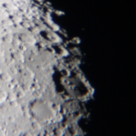 画像中央の明暗境界線に浮かぶ巨大なクレーターがクラビウス。 このクレーターは直径225km。南のクレーターの多い高地の中央部に位置してい る。月齢8日から9日にかけて朝を迎える。その姿は壮大だ。クレーターの南の縁に あるラザフォードというクレーターは直径52kmもある。この他にもクラビウスの 底には、直径28km、21km、13kmのクレーターがあり、いずれも朝日を浴びて西 側の斜面が明るく輝いて見える。 影の様子からクレーターの中央部が盛り上がっていることを観察してみよう。月が 丸い天体であり、クラビウスの底の起伏も月面の曲率に沿っているのだ。 月齢9日になると、クレーターの底のかなりの部分が日に照らし出され、かわって 隣のクレーター、ブランカナスがシルエットを現すようになる。