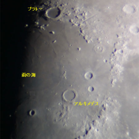 雨の海西部。中央やや下の丸いクレーターがアルキメデス。