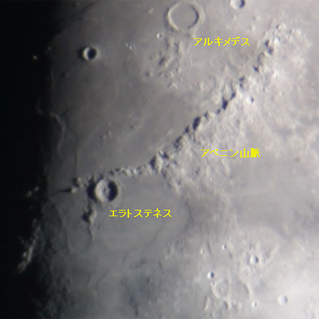 アペニン山脈の起伏とその右のクレーターエラトステネスに注目。