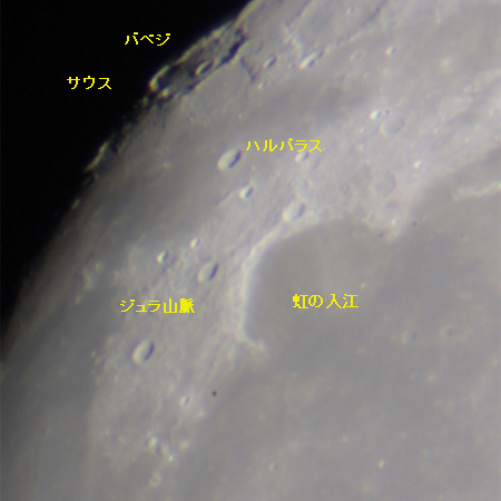 ジュラ山脈の奥に見えるクレーターはバベジ。 その手前のクレーターがサウス。バベジの影に注目。