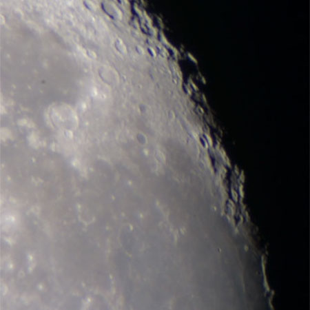 明暗境界線近くに小さいがくっきりみえるクレーターがある。