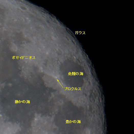 黒い色をした海は、左から静かの海、危難の海、その下の豊かの海である。