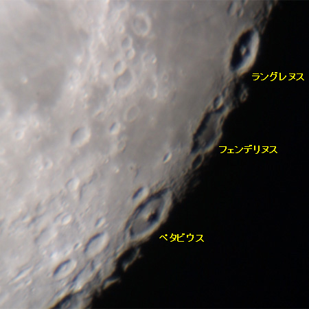 ラングレヌスとペタビウスの中央丘に夕日が当たって輝いて見える。