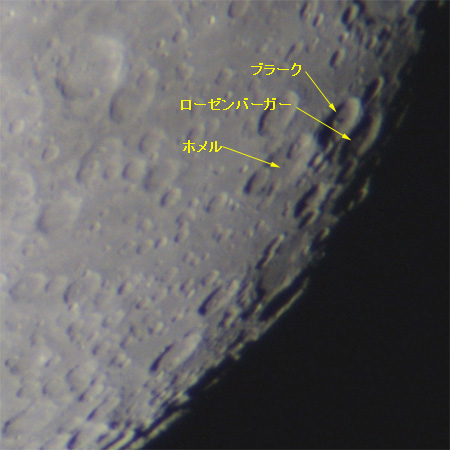 写真右上の中央丘型クレーターがブラーク。その右がローゼンベルガー(96km)。
