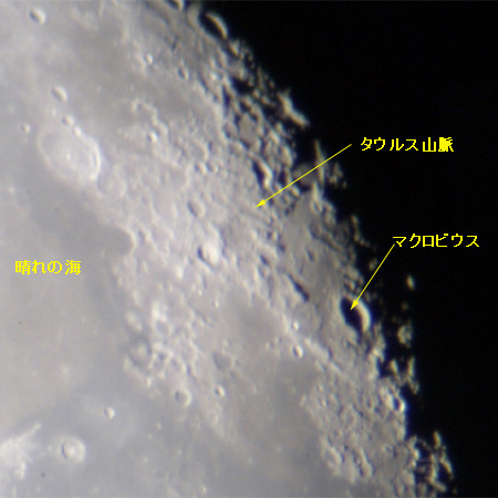 明暗境界線近くのくっきりしたクレーターがマクロビウス(直径km)。