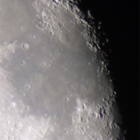 中央の黒っぽい平原が静かの海。その東部にコーシーの断崖が薄っすらと見える。