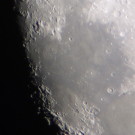 中央の黒っぽい平原が静かの海。その東部にコーシーの断崖が薄っすらと見える。