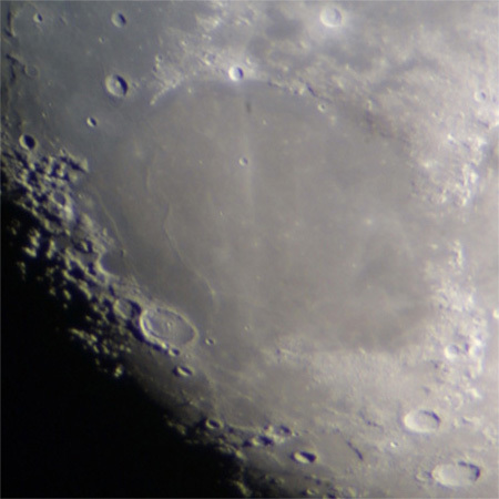 晴れの海の溶岩平原にリッジ(山脈)が走っているのがわかる。