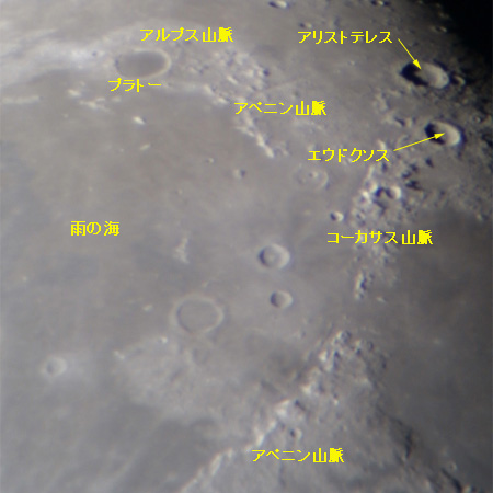 写真中央部の黒っぽい地域が雨の海。その南西縁はアペニン山脈。