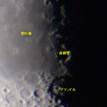 直線壁のすぐ南の大きなクレーターがデランドル(直径234km)。