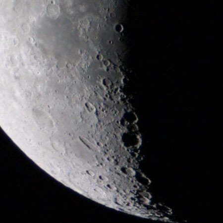 南極方面へ向かって明暗境界線をたどっていくと細長い形のクレーター・シラーをみつけることができる。