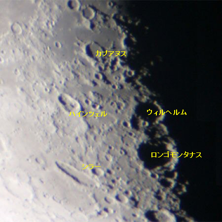 暗闇に消えかけていく大きなクレーターはヴィルヘルム(上)とロンゴモンタヌス(直径145km)。