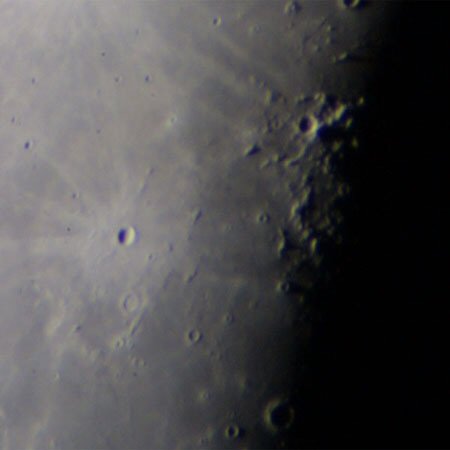 夕暮れが迫るカルパチア山脈。くっきりしたクレーターはT.メイヤー。