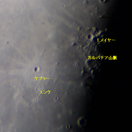 夕暮れが迫るカルパチア山脈。くっきりしたクレーターはT.メイヤー。