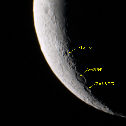 最南端に大きなクレーターがある。半分夕闇に消えているこのクレーターがバイリー。