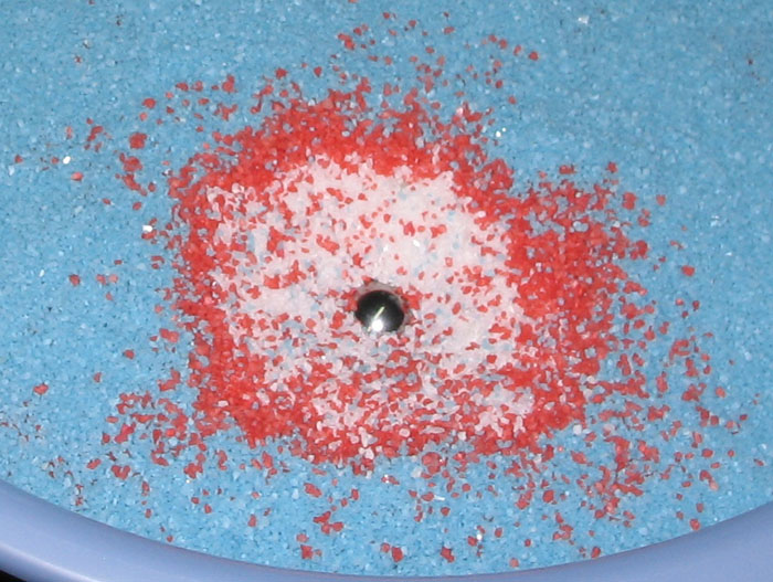白い砂の上に、黄色い層、青い層をつくり、鉄球を落下させました。