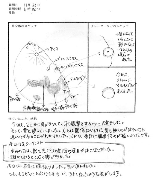 海の分布、中央丘のあるクレーターが描かれています。月を観察して雲の動きにも気づいたことが