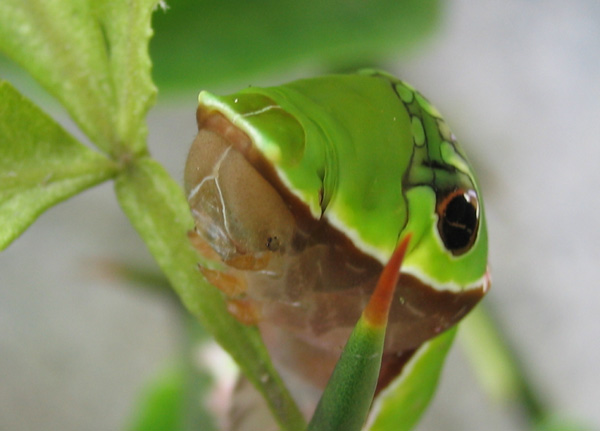 ナミアゲハの幼虫と比べると,腹側の部分の色が薄い赤紫色です.