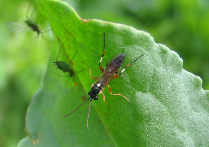後肢の斑紋からヒラタアブヤドリヒメバチ亜科と判断しました。