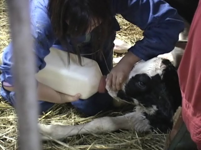母牛から絞ったミルクを子牛に慎重に飲ませています.