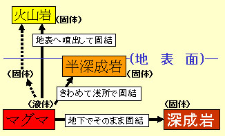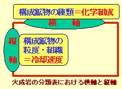 ただし,これらの区分は,すべて液体のマグマが直接固結した場合に限られます。火山岩には,火山灰のように固体の破片が堆積してできた岩石もありますから,このようにはなりません。 |