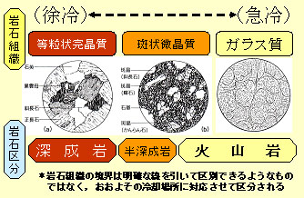 ゆっくり冷えれば,鉱物の成長する時間が確保され,同じような大きさに成長した(等粒状の)鉱物に埋め尽くされた(完晶質の)岩石が形成されることになります。この対極にあたる岩石は,マグマが急速に冷えてしまい,まったく鉱物を成長させることができずにガラスになります。鉱物がマグマ内にある程度晶出している段階で急に冷やされるような場合には,途中段階にあたる斑状微晶質の組織を形成します。これによって,地下での冷却を意味する「深成岩」と地表での冷却を意味する「火山岩」に大別されますが,火山岩に近いが地下に存在するような中間的な冷却を表現するために「半深成岩」という区分を中間に設けて3段階にしています。