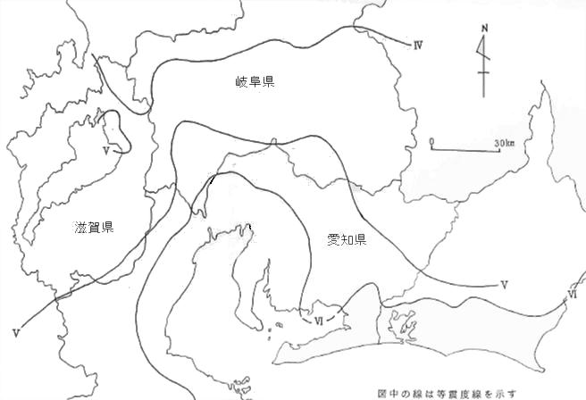 と鳴動し、電灯のような吊り下げ物は相当ゆれ、器内の水面の動くのがわかる程度の地震。