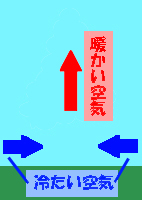 | 雷を発生させる雲は『雷雲』と呼ばれる、入道雲のようなものです。この雲ができなければ雷は発生しません。 右図では冷たい空気が流れ込んでくることで暖かい空気が上空に押し上げられているところです。こうした場合や、山などに風がぶつかったときなどに上昇気流が生じます。この上昇気流の強さによって雷雲ができるかどうかが決まります。 |