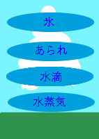 ○ | ○ | 上昇気流が発生した場合、地上付近に存在する水蒸気もこの気流に乗って上空へと移動していきます。 高度が上がるとその分気温も下がるため、地上付近に存在した水蒸気はやがて水滴に変化していきます。強い上昇気流によって、より高くまで水蒸気が運ばれると、あられ、さらに上昇すると氷に変化します。 |