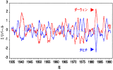 タヒチ (太平洋東部) とダーウイン (太平洋西部) の大気圧の経年変化。両者の間には顕著な逆相関がある。この2点の気圧差は現在,南方振動指数SOI(southern oscillation index)として使われている。