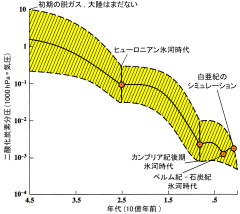 カスティング [解説]は,地表が凍結したことはないいう条件をもとに,過去の二酸化炭素濃度の変遷を求めた。このうして得られたグラフが図である。ただしこれは,7億年前と25億年前の氷河時代を計算に入れている。